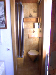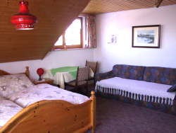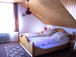 Unser geräumiges Doppelzimmer mit DU/WC, bietet Platz für 2 Personen und ist ausgestattet mit Kühlschrank, Kaffeemaschine und SAT-TV. Zugang zur Terrasse über das Treppenhaus.